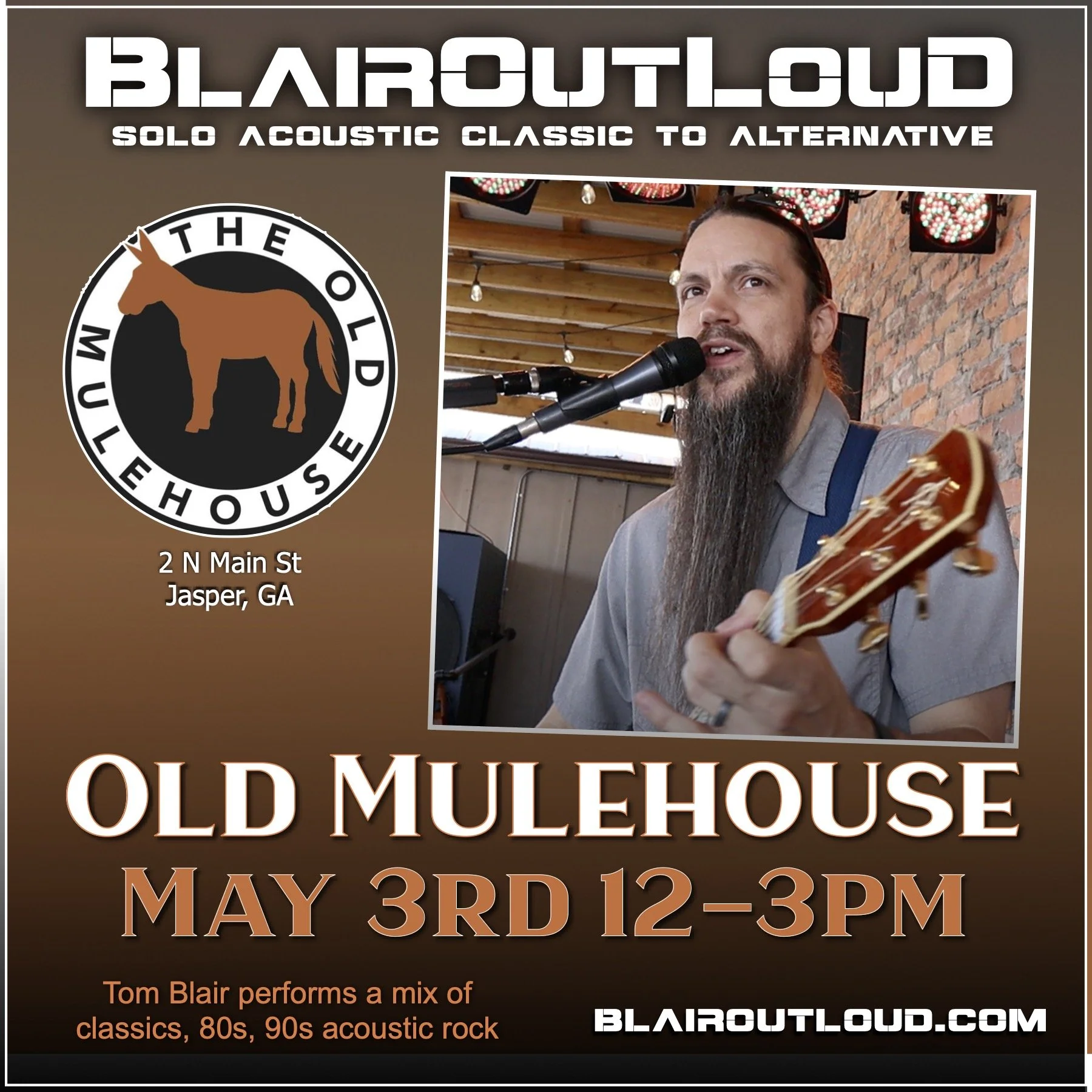Very excited that I will be back in Jasper, GA at Old Mulehouse THIS SUNDAY May 3rd, 2026 starting at Noon.. playing for there brunch crowd on the beautiful deck! Come join me and enjoy some delicious brunch, and tasty drinks. I’ll be performing my SOLO acoustic rock selections and taking requests. Thanks all!