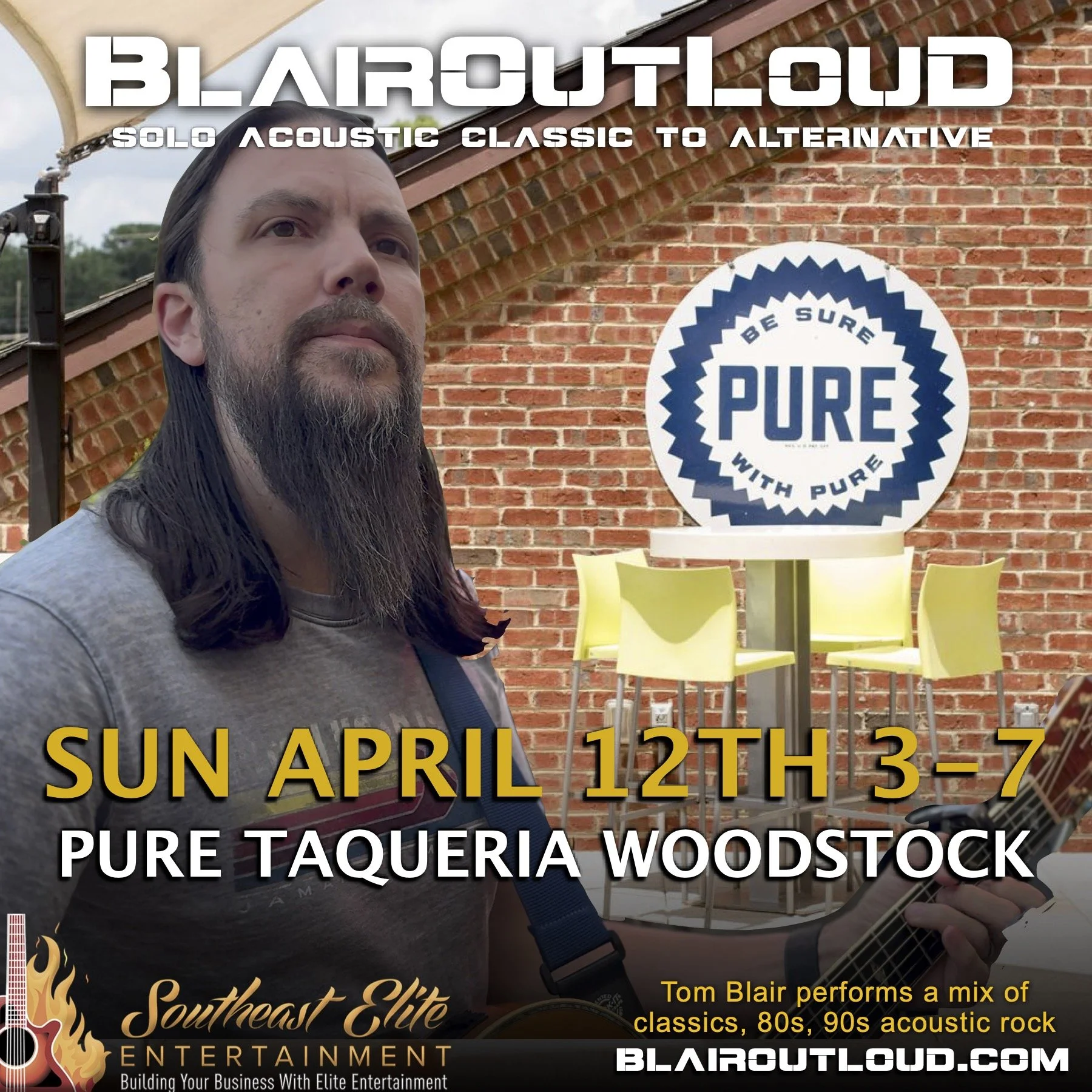 Friends and fans.. I’m happy to announce that I’ll be back on the rooftop over at Pure Taqueria in Woodstock, GA on Sunday April 12th from 3-7pm! This place has awesome views of downtown Woodstock, and has great food and tasty drinks. Come enjoy some great live music and I’ll see you there!