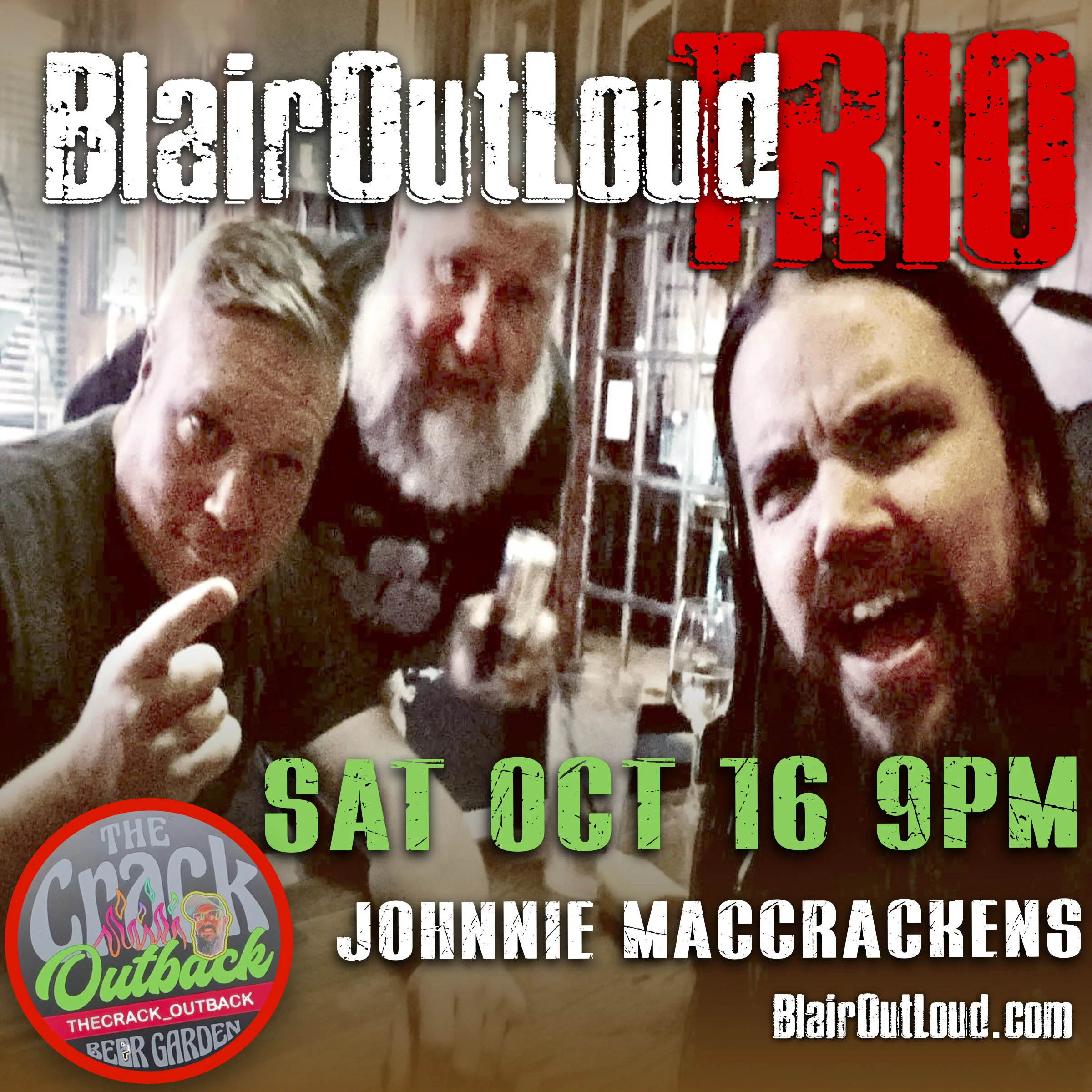 Back to All Events BlairOutLoud TRIO returns to The Crack! Saturday, October 16, 2021 9:30 PM 11:59 PM Johnnie MacCrackens 15 Atlanta Street Southeast Marietta, GA, 30060 United States (map) Google Calendar ICS The dudes are back for more fun at MacCrackens (weather permitting The Crack Outback)! BlairOutLoud TRIO brings the best classic rock, 80s hits, and 90s jams to entertain the crowd.. All your favorite tunes.. Come see us!