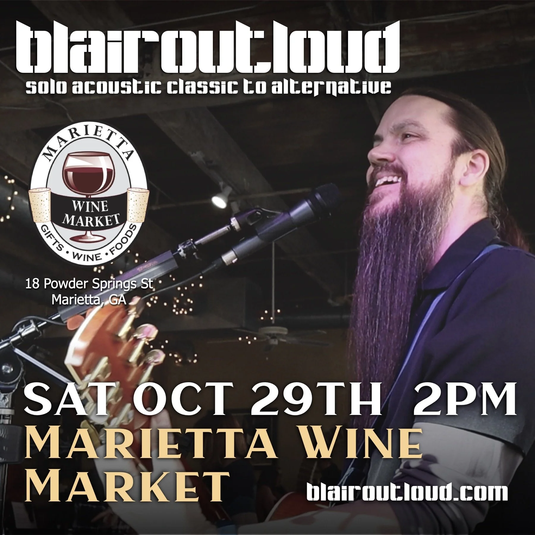 Back to All Events BlairOutLoud SOLO back at Marietta Wine Market! Saturday, October 29, 2022 2:00 PM 8:00 PM Marietta Wine Market 18 Powder Springs Street Marietta, GA, 30060 United States (map) Google Calendar ICS View fullsize Tom from BlairOutLoud performs SOLO on the beautiful Marietta Square at Marietta Wine Market! Come enjoy wine tastings, food pairing, and great live music! 2-5 / 6-8