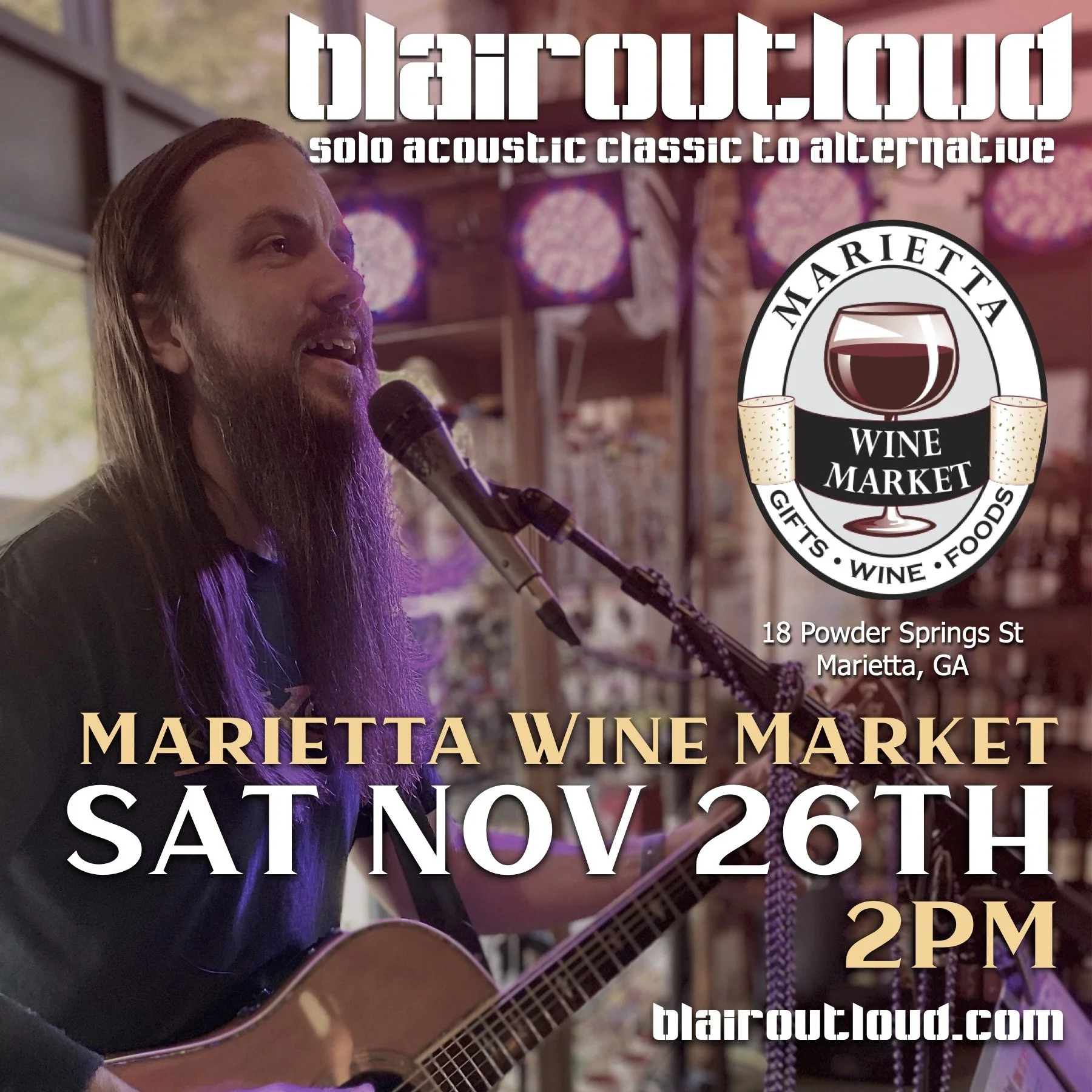 Back to All Events BlairOutLoud SOLO Live at Marietta Wine! Saturday, November 26, 2022 2:00 PM 8:00 PM Marietta Wine Market 18 Powder Springs Street Marietta, GA, 30060 United States (map) Google Calendar ICS View fullsize Tom from BlairOutLoud performs SOLO on the beautiful Marietta Square at Marietta Wine Market! Come enjoy wine tastings, food pairing, and great live music! 2-5 / 6-8 Thanksgiving Weekend Fan Appreciation Day!