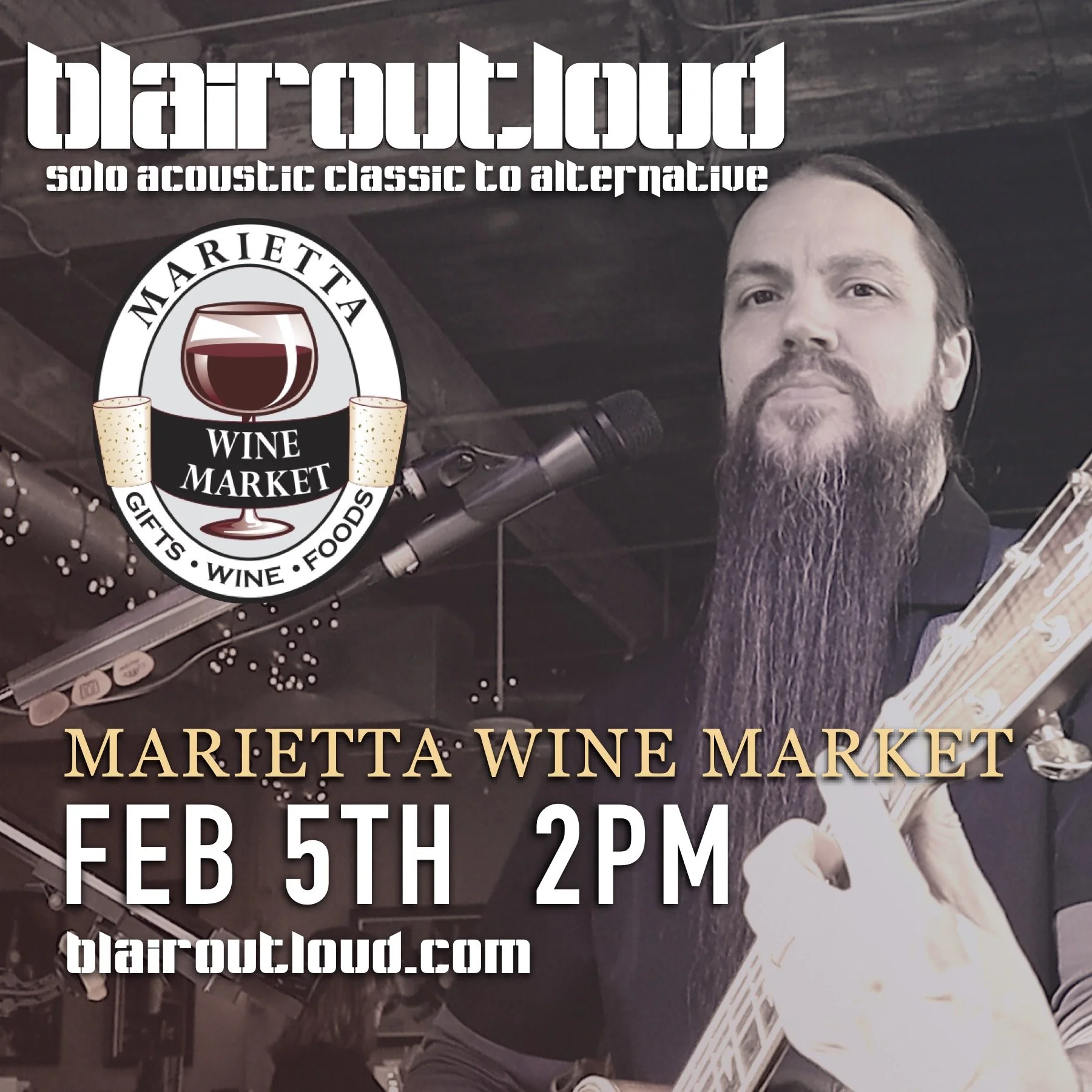 Back to All Events BlairOutLoud SOLO at Marietta Wine Market! Saturday, February 5, 2022 2:00 PM 8:00 PM Marietta Wine Market 18 Powder Springs Street Marietta, GA, 30060 United States (map) Google Calendar ICS View fullsize Tom from BlairOutLoud performs SOLO on the beautiful Marietta Square at Marietta Wine Market February 5th starting at 2pm! Come enjoy wine tastings, food pairing, and great live music! 2-5 / 6-8