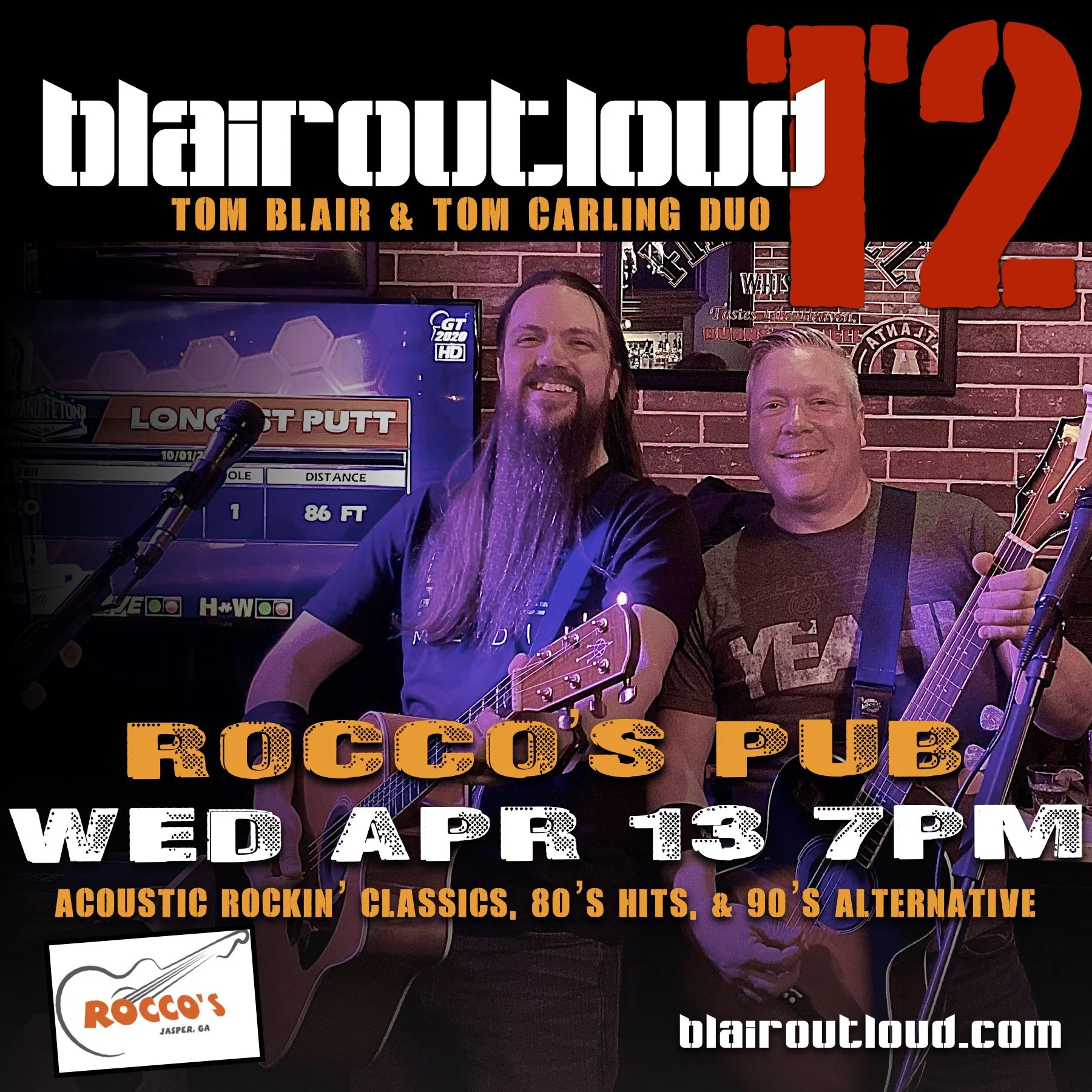 The BlairOutLoud T2 DUO performs at Rocco’s Pub Wednesday night April 13th at 7pm! Acoustic rockin’ classic songs from 60s to today.. Tom Blair and Tom Carling accept requests and look forward to entertaining you on this fun Wednesday night in Jasper, GA. Come grab great food, drinks, and check out some live music!