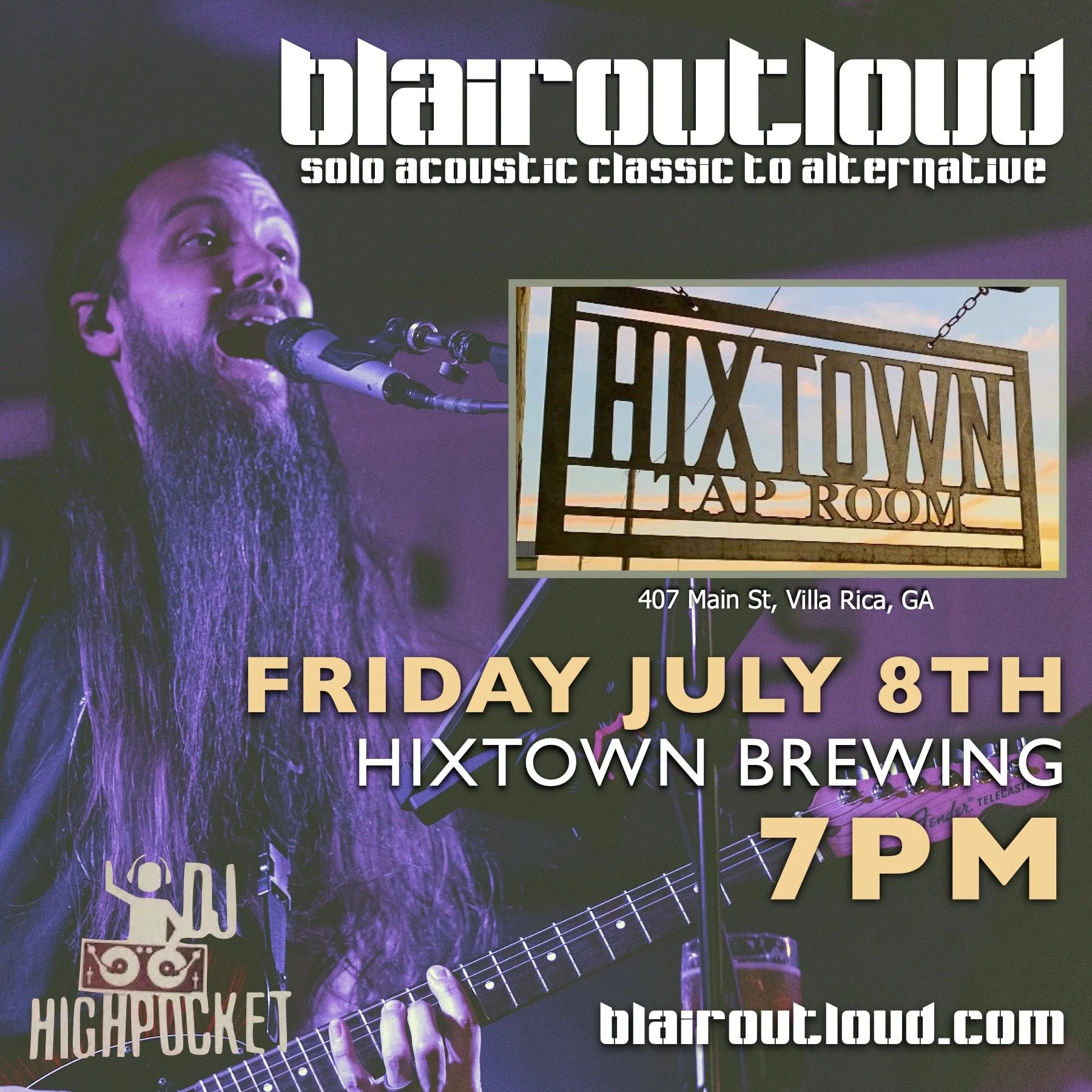 BlairOutLoud SOLO Live at Hixtown Brewing! Friday, July 8, 2022 7:00 PM 10:00 PM Hixtown Brewing 407 Main St Villa Rica, GA 30180 United States (map) Google Calendar ICS View fullsize Catch BlairOutLoud SOLO performance at Hixtown Brewing in Villa Rica, GA on Friday July 8th, 2022. Come enjoy great drinks, a fun atmosphere, and great live music! Request from a huge songlist.. See you there!