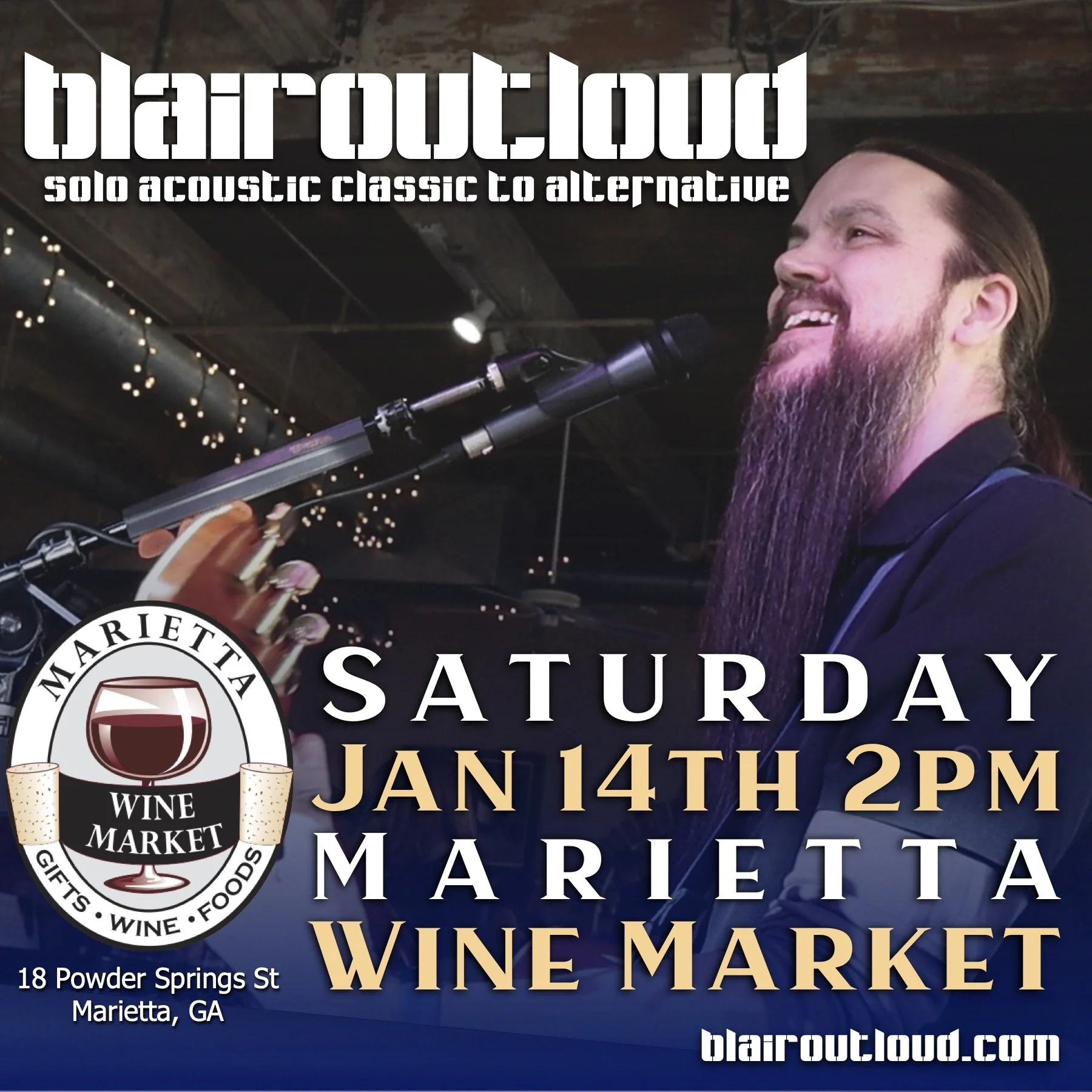 Back to All Events BlairOutLoud SOLO performs at Marietta Wine! Saturday, January 14, 2023 2:00 PM 8:00 PM Marietta Wine Market 18 Powder Springs Street Marietta, GA, 30060 United States (map) Google Calendar ICS View fullsize Tom from BlairOutLoud performs SOLO on the beautiful Marietta Square at Marietta Wine Market! Come enjoy wine tastings, food pairing, and great live music! 2-5 / 6-8 Happy New Year!