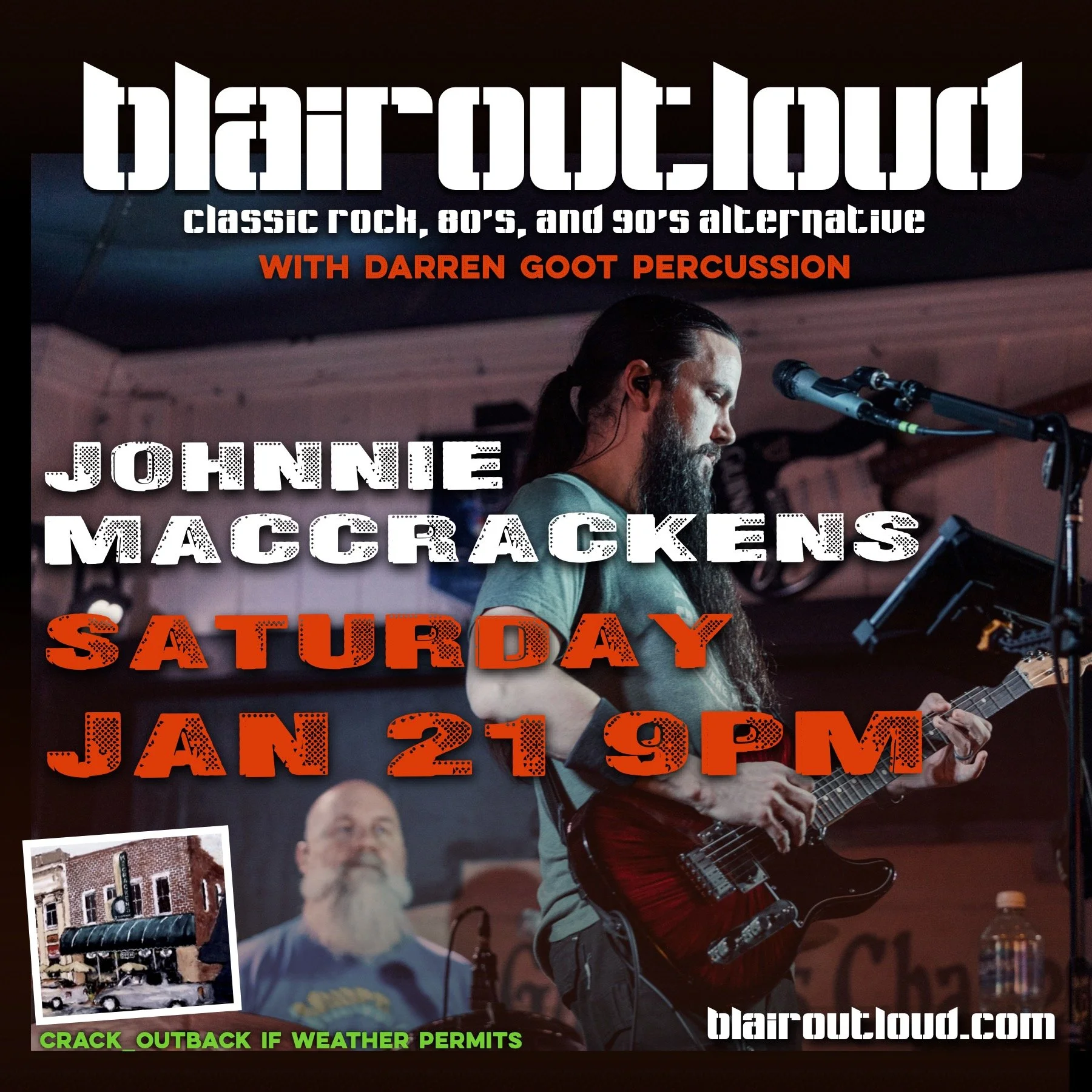 Tom from BlairOutLoud brings the best classic rock, 80s hits, and 90s jams to entertain the crowd.. Joined by Darren Goot on the drums, this dynamic duo will rock your face! Inside MacCrackens.. or out at the Crack Outback if weather permits. Come out and hang!