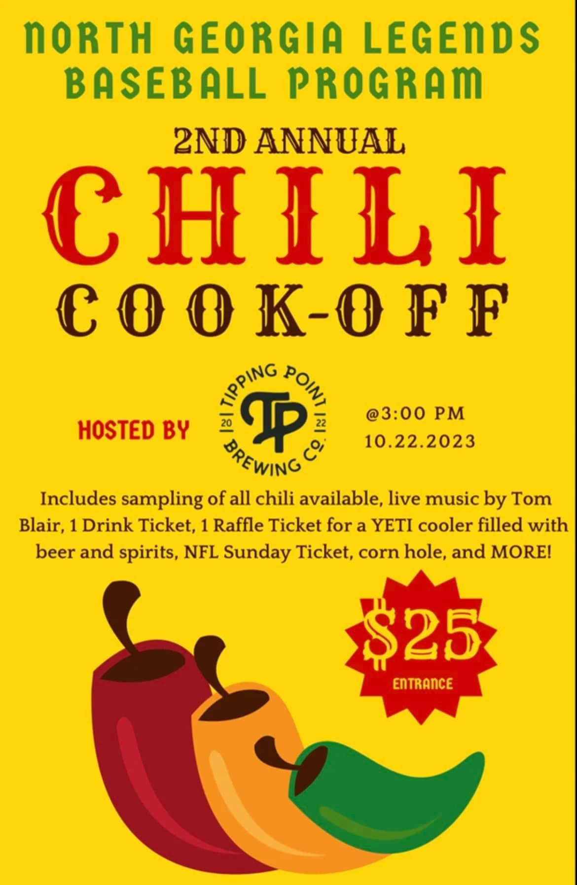 Tom from BlairOutLoud performs at a Chili-Cookoff Sunday Funday Event on Sunday Oct 22, 2023 at 3pm! Chili Cook-Off, Live Music, a chance to win a large YETI cooler filled with beer and spirits, corn hole, and MORE! To attend it is $25 per person. Includes sampling of all the chili available, cover charge for music, 1 Drink Ticket, 1 Raffle Ticket for the YETI cooler, NFL Sunday Ticket, corn hole, and MORE! All proceeds benefit the 2023 North Georgia Legends Baseball Team!