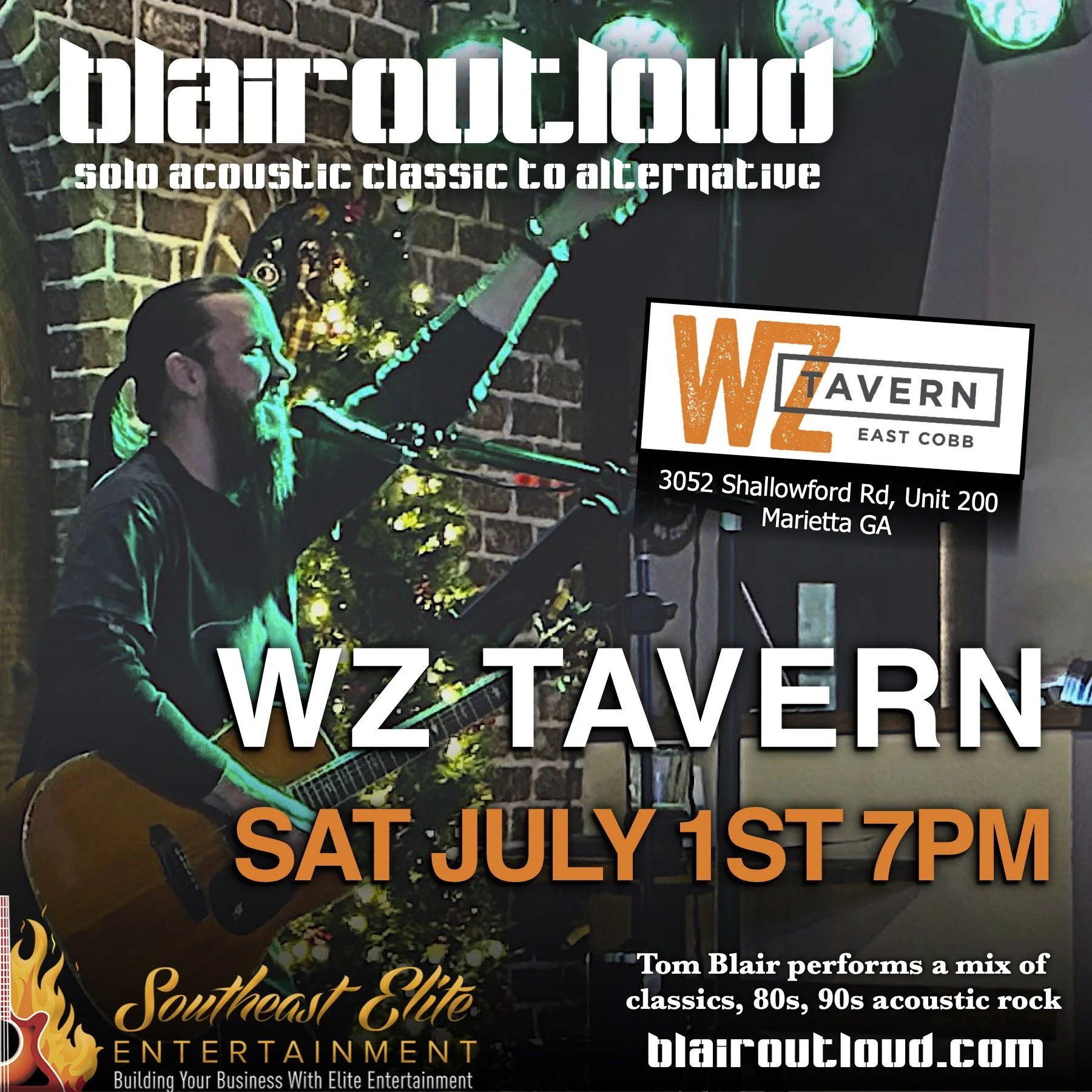Tom from BlairOutLoud brings a fun acoustic rockin’ set to WZ Tavern in East Cobb! Come enjoy great food, drinks, and great live music! Request songs from a huge playlist filled with classic rock, 80s hits, and 90s alternative. This event is sponsored by Southeast Elite Entertainment.