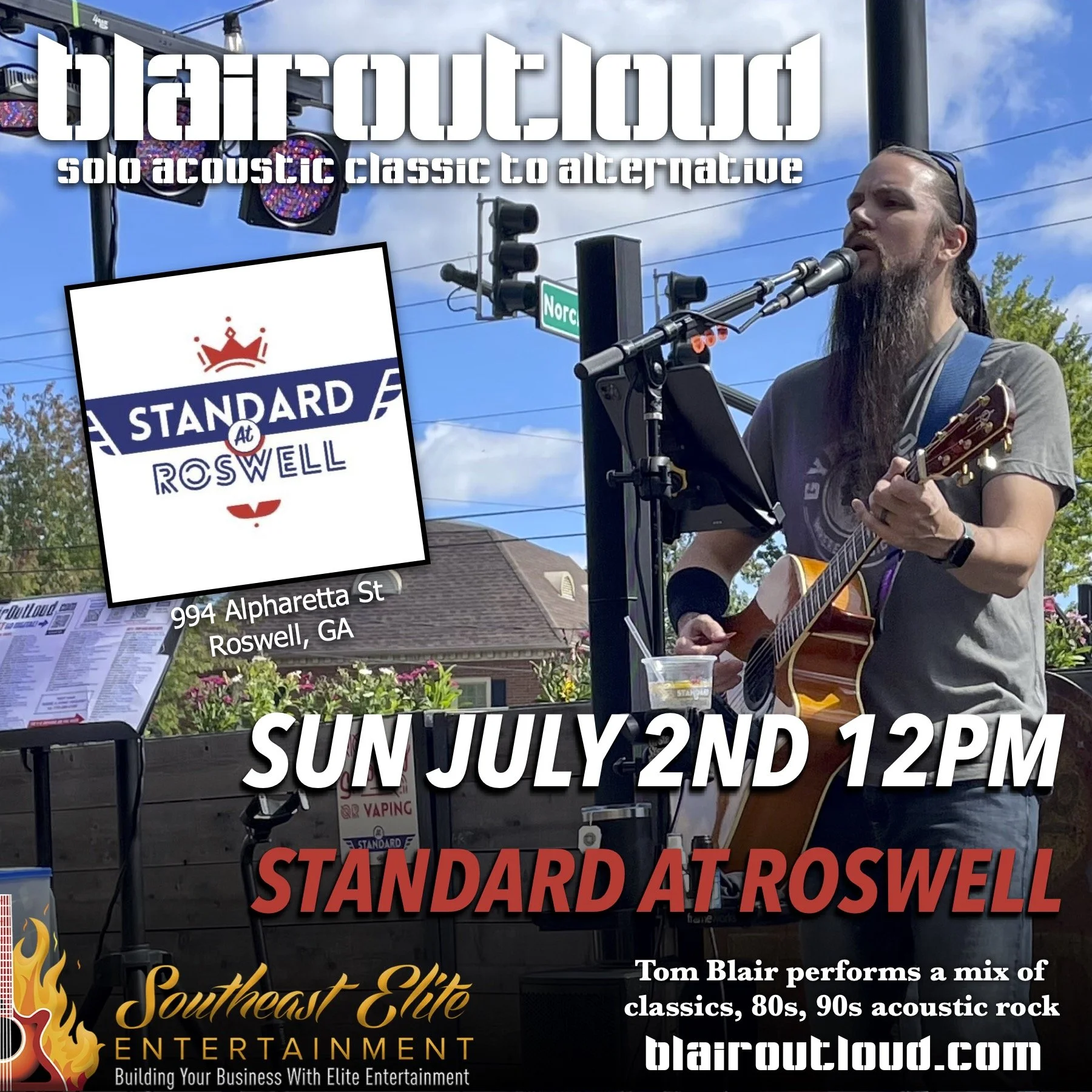 BlairOutLoud SOLO strumming at Standard! Sunday, July 2, 2023 12:00 PM 4:00 PM Standard In Roswell 994 Alpharetta Street Roswell, GA, 30075 United States (map) Google Calendar ICS Join Tom from BlairOutLoud for some great food and fun at Standard at Roswell! Request songs, enjoy great food and beverages, and enjoy a wonderful afternoon in downtown Roswell. Event sponsored by Southeast Elite Entertainment.