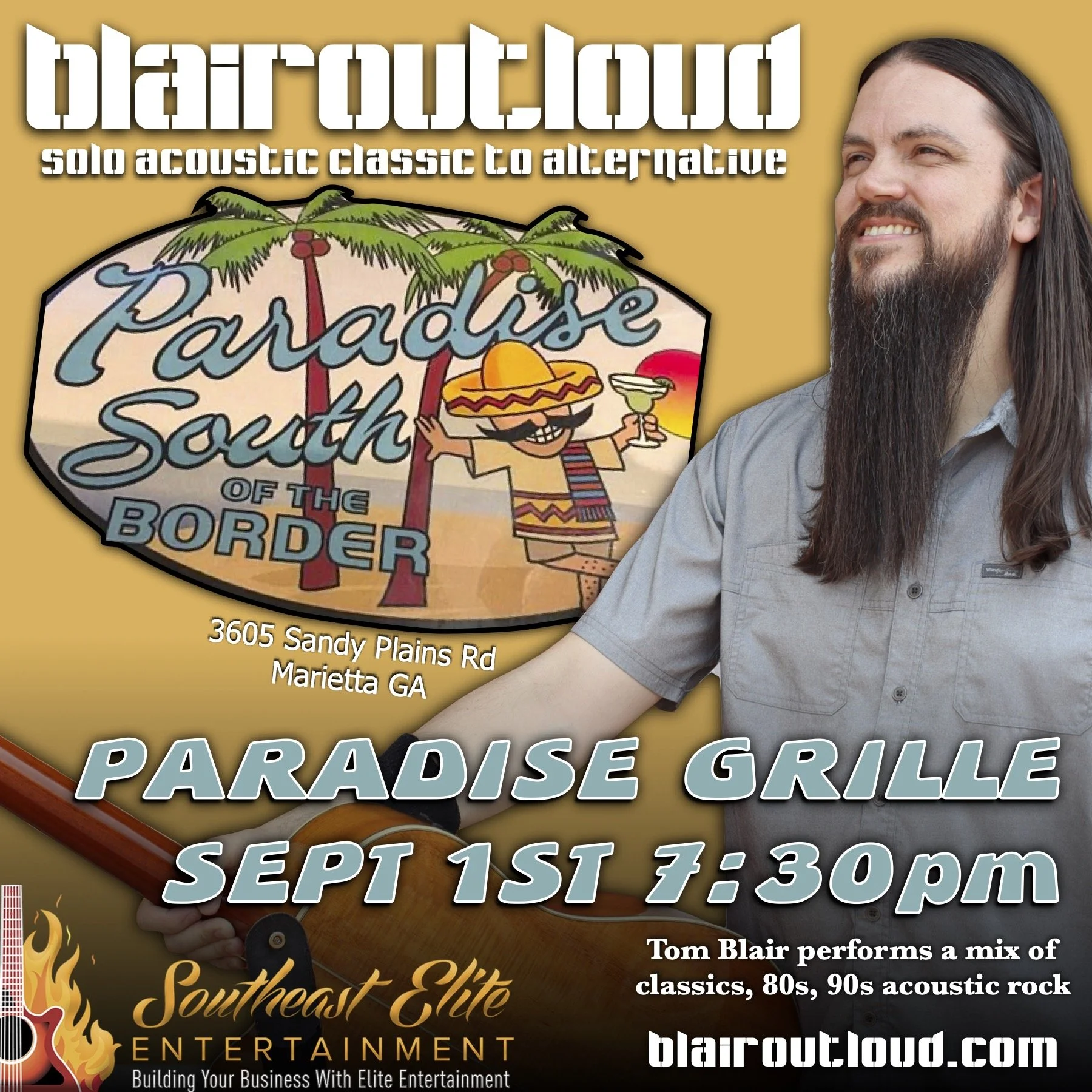 Tom from BlairOutLoud is bringing the solo acoustic show to Paradise Grille / Paradise South of the Border! East Cobb friends and family know about this fantastic spot for food and drinks.. come enjoy great live music as well! This event sponsored by Southeast Elite Entertainment.