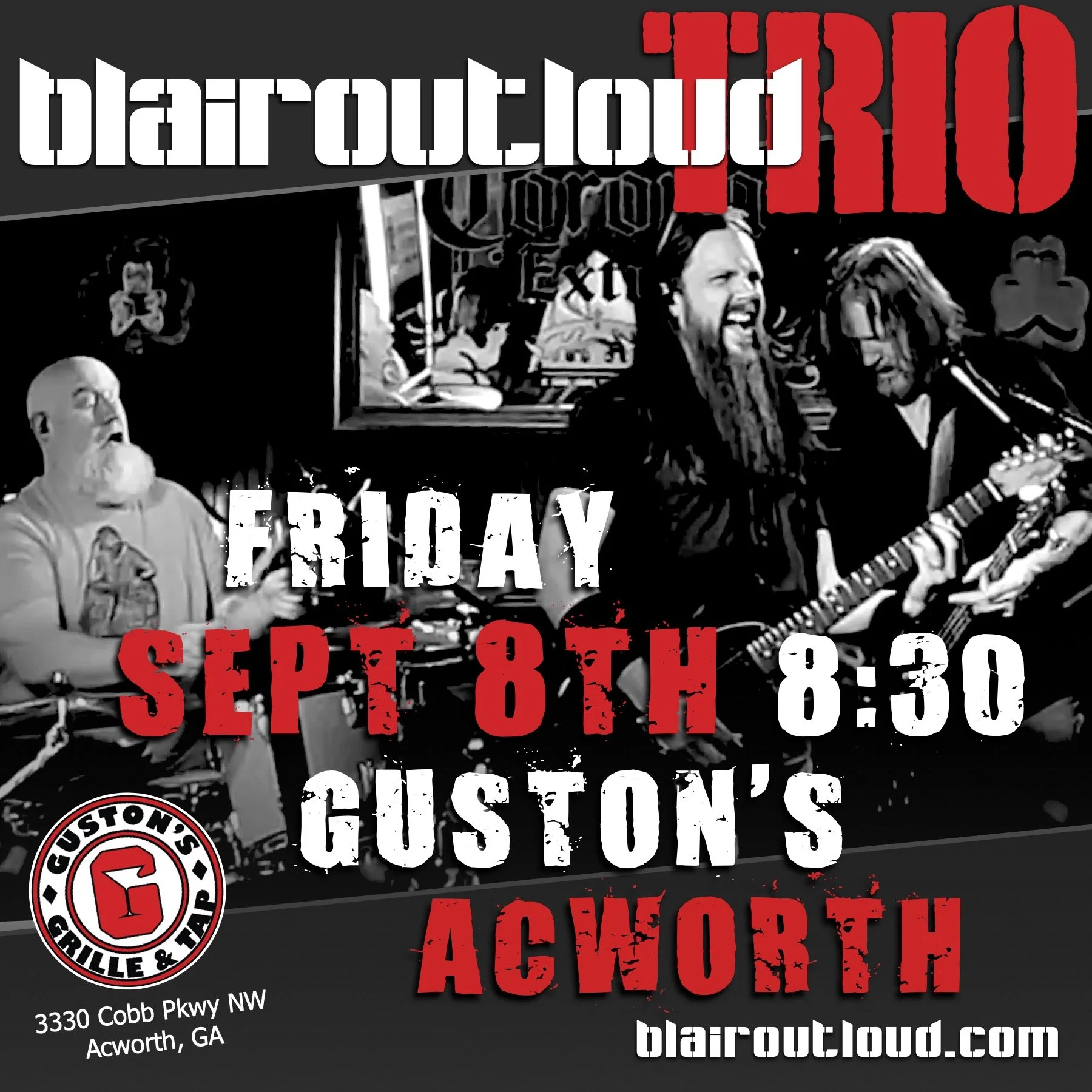 Oh no.. who let the BlairOutLoud TRIO back in over at Guston’s Acworth!? Never too serious, these guys jam classic rock, 80s hits, and 90s alternative. They take requests and engage with the crowd. Come grab some dinner, drinks, and sing along with the guys on this killer Friday night!
