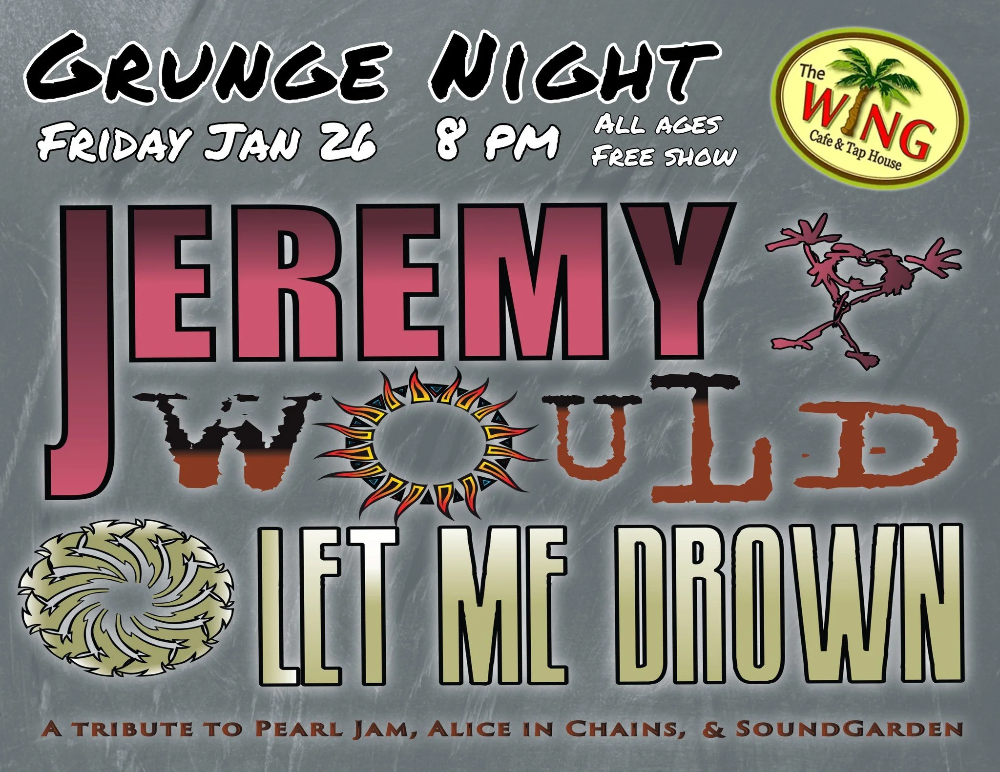 Tom Blair is now performing as guitarist and co-vocalist with the grunge tribute to Pearl Jam, Alice In Chains, and Soundgarden called “Jeremy Would Let Me Drown” (JWLMD, or just “Jeremy” for short). Come get the best wings in town at the Wing & Tap House, and rock out to some of the best 90’s music ever created. FREE SHOW, ALL AGES!