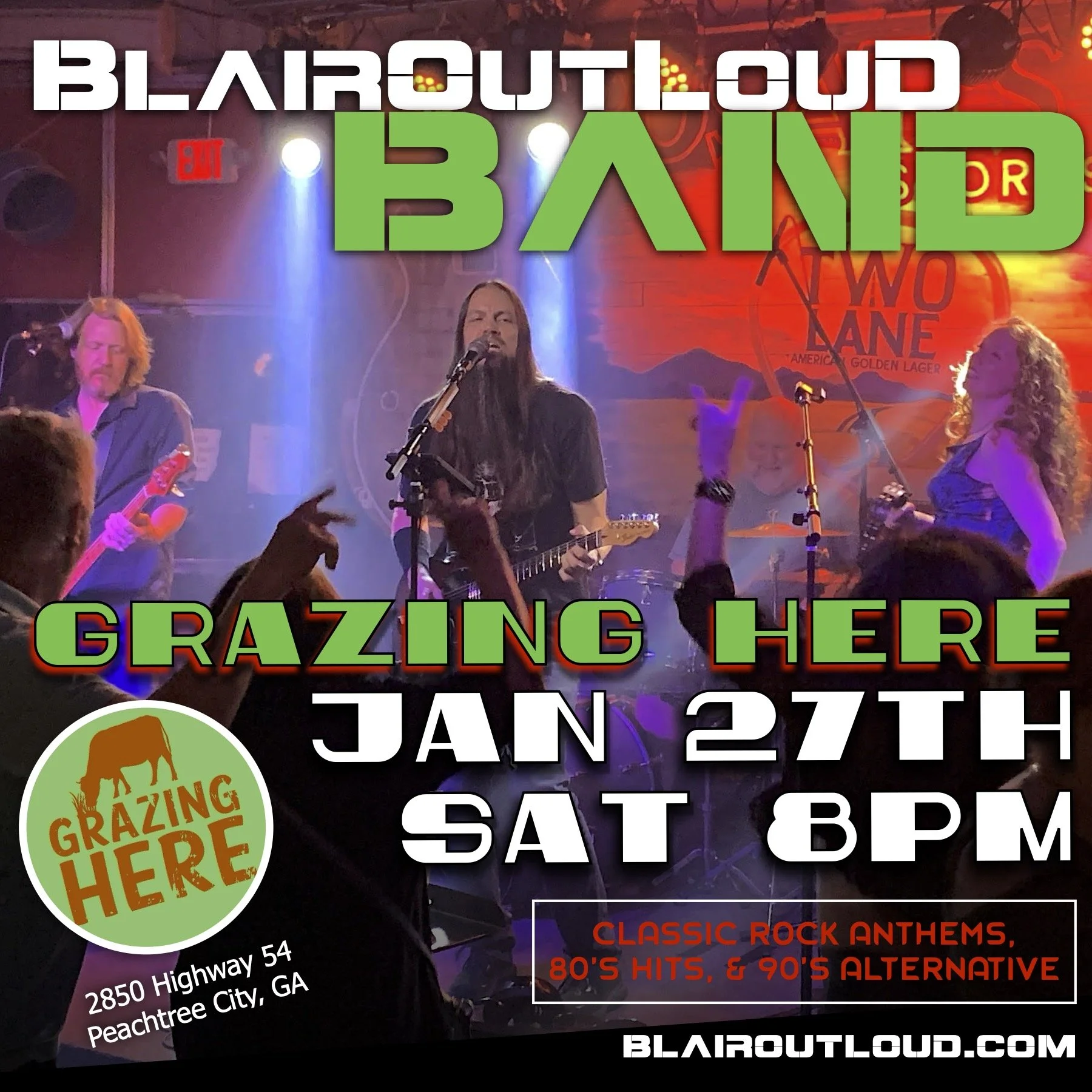 BlairOutLoud BAND is back in action, finally getting a chance to come rock out with our PTree City friends and fans! This band performs classic rock anthems, 80s hits, and 90's alternative and we love it when you dance, sing along, and even head bang with us. Great food, fun, and rock and roll.. come see us! Invite your friends!