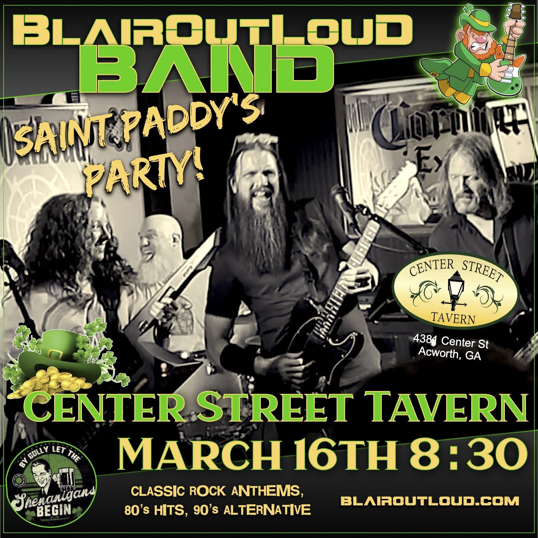 WHOA.. the FULL BlairOutLoud BAND returns to rock the house at Center Street for a killer St Paddy's Party! Tons of tasty greeny drinks, terrific food menu, and an entertaining band to keep you ShamRockin’ it all night long! Saturday March 16th come out to Center Street Tavern in Acworth! Get there early.. this place will be packed!