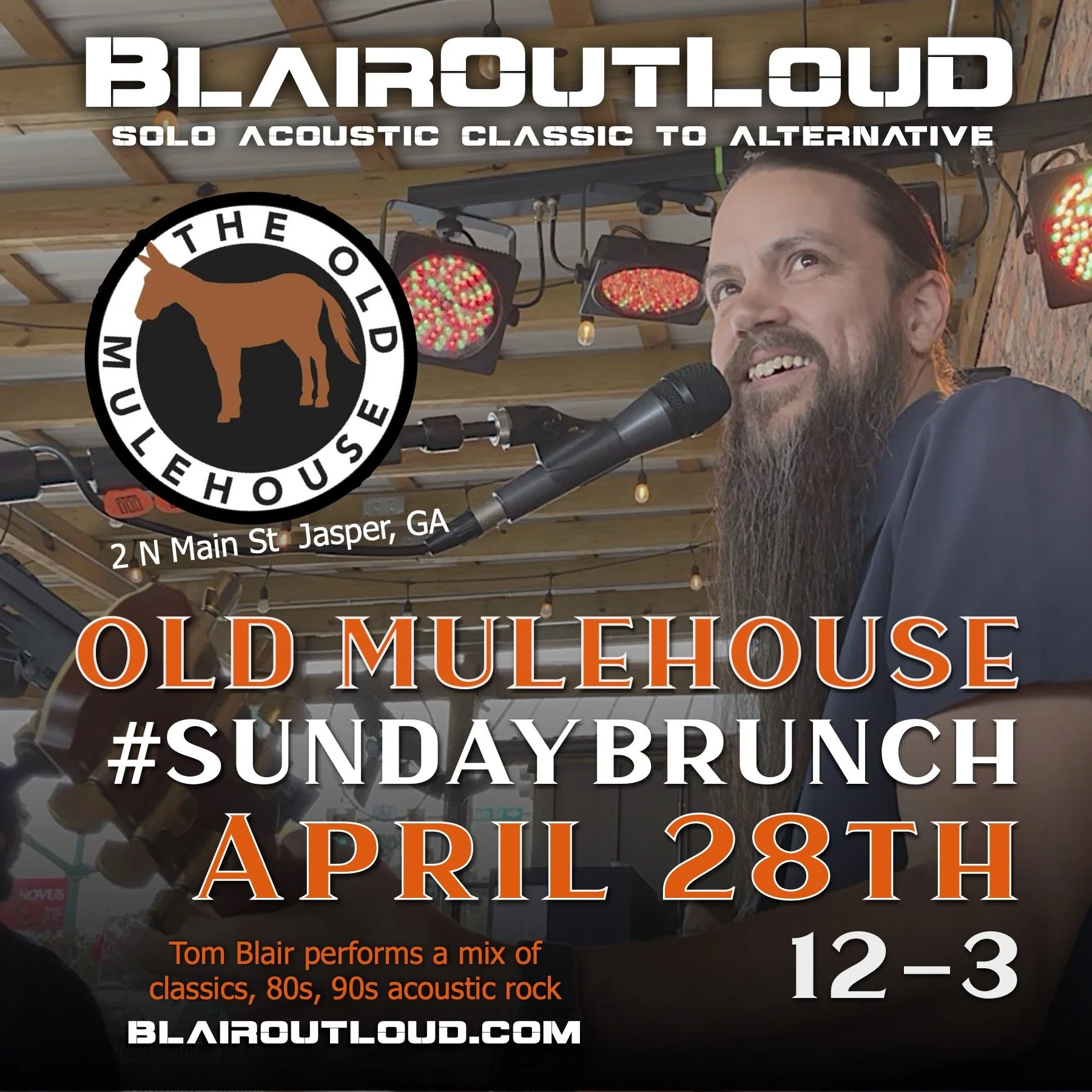 BlairOutLoud SOLO brunch at Old Mulehouse! Sunday, April 28, 2024 12:00 PM 3:00 PM Old Mulehouse 2 N Main Street Jasper, GA United States (map) Google Calendar ICS View fullsize Tom from BlairOutLoud is back to serve up some fun acoustic music on the most beautiful deck in Jasper at Old Mulehouse! This is a great place to get Sunday Brunch.. great food, great vibe, and great live music! Come check it out.