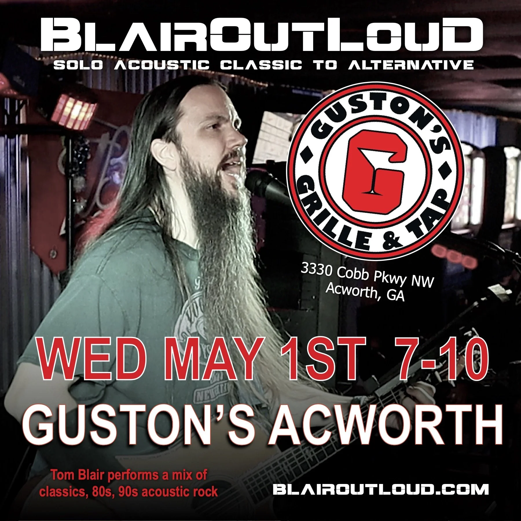 BlairOutLoud SOLO performing at Guston's Acworth! Wednesday, May 1, 2024 7:00 PM 10:00 PM Guston's Acworth 3330 Cobb Parkway Northwest Acworth, GA, 30101 United States (map) Google Calendar ICS Tom from BlairOutLoud performs live at Guston’s Acworth! Hump Day fun, as Tom takes requests from a huge songfest and engages the crowd. Come enjoy great food, drinks, and live music!